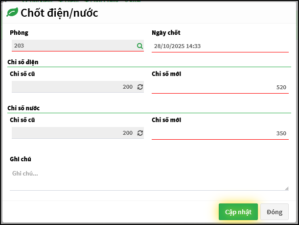 Chốt dịch vụ cũng là 1 bước khá qua trong trong quản lý dịch vụ, phần mềm hỗ trợ chốt điện/nước theo nhiều hình thức